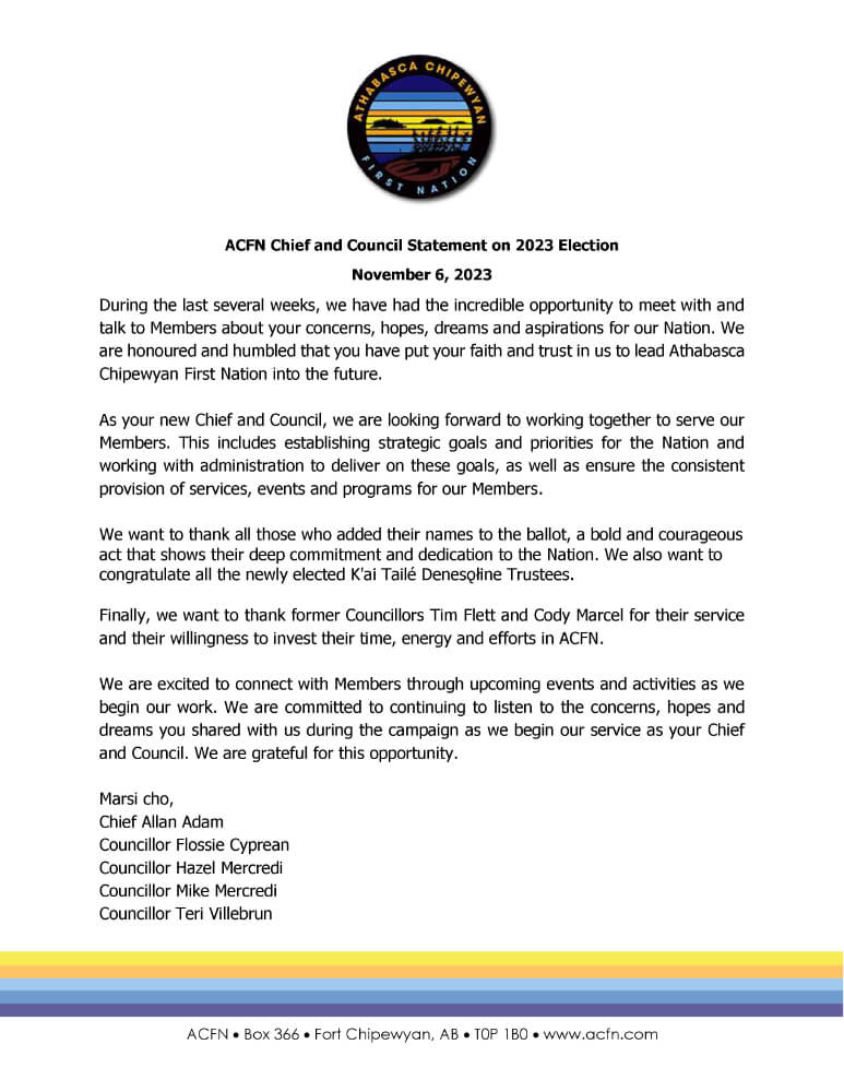 ACFN Chief and Council Statement to Members November 6 2023