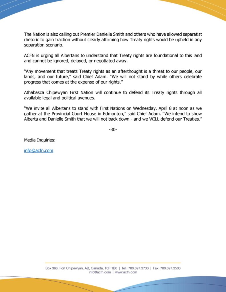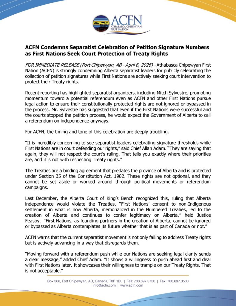 ACFN Condemns Separatist Celebration of Petition Signature Numbers as First Nations Seek Court Protection of Treaty Rights