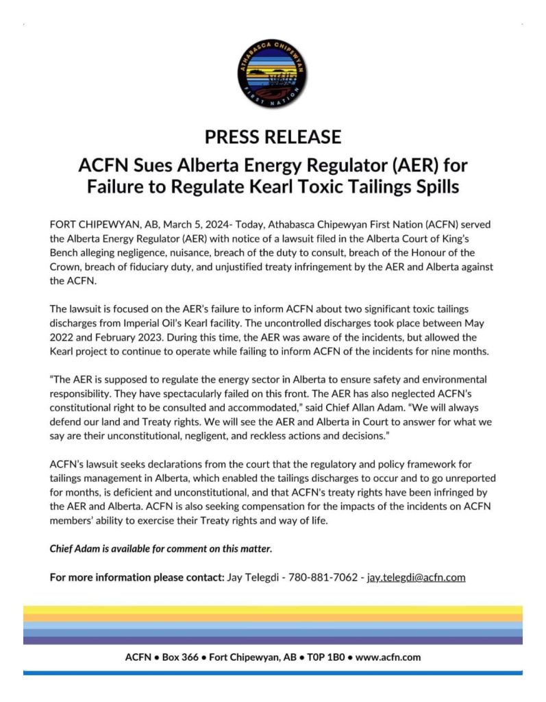 ACFN Sues AER for Failure to Regulate Kearl Toxic Tailings Spills