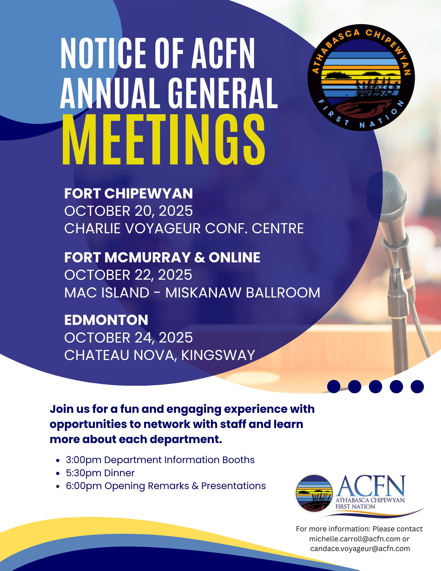 Date Oct 24 2025 Expired! Time 3:00 pm - 8:00 pm ACFN 2025 Annual General Meeting – Edmonton Share this event + Add to Google Calendar + iCal / Outlook export