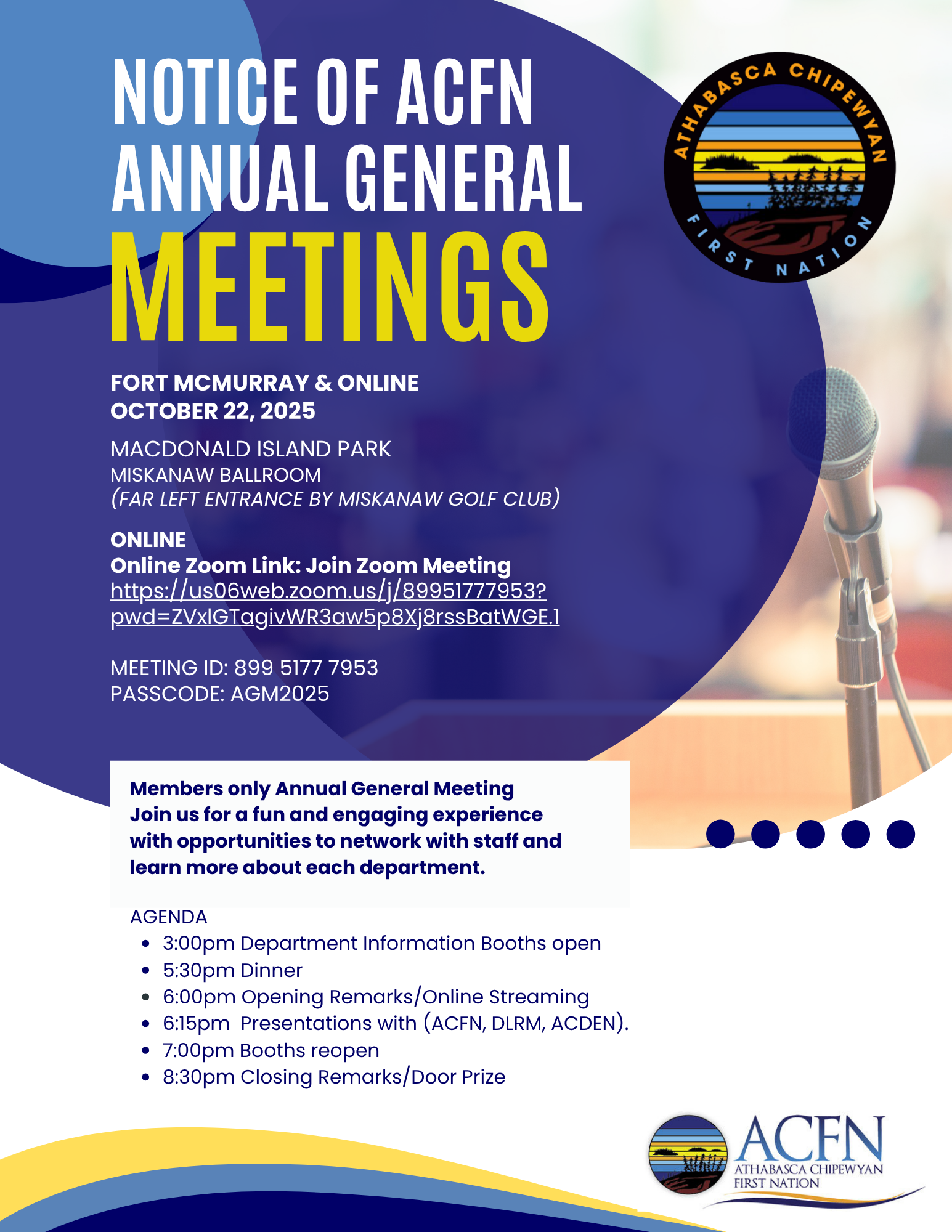 Date Oct 22 2025 Expired! Time 3:00 pm - 8:00 pm ACFN 2025 Annual General Meeting – Fort McMurray and Online Share this event + Add to Google Calendar + iCal / Outlook export