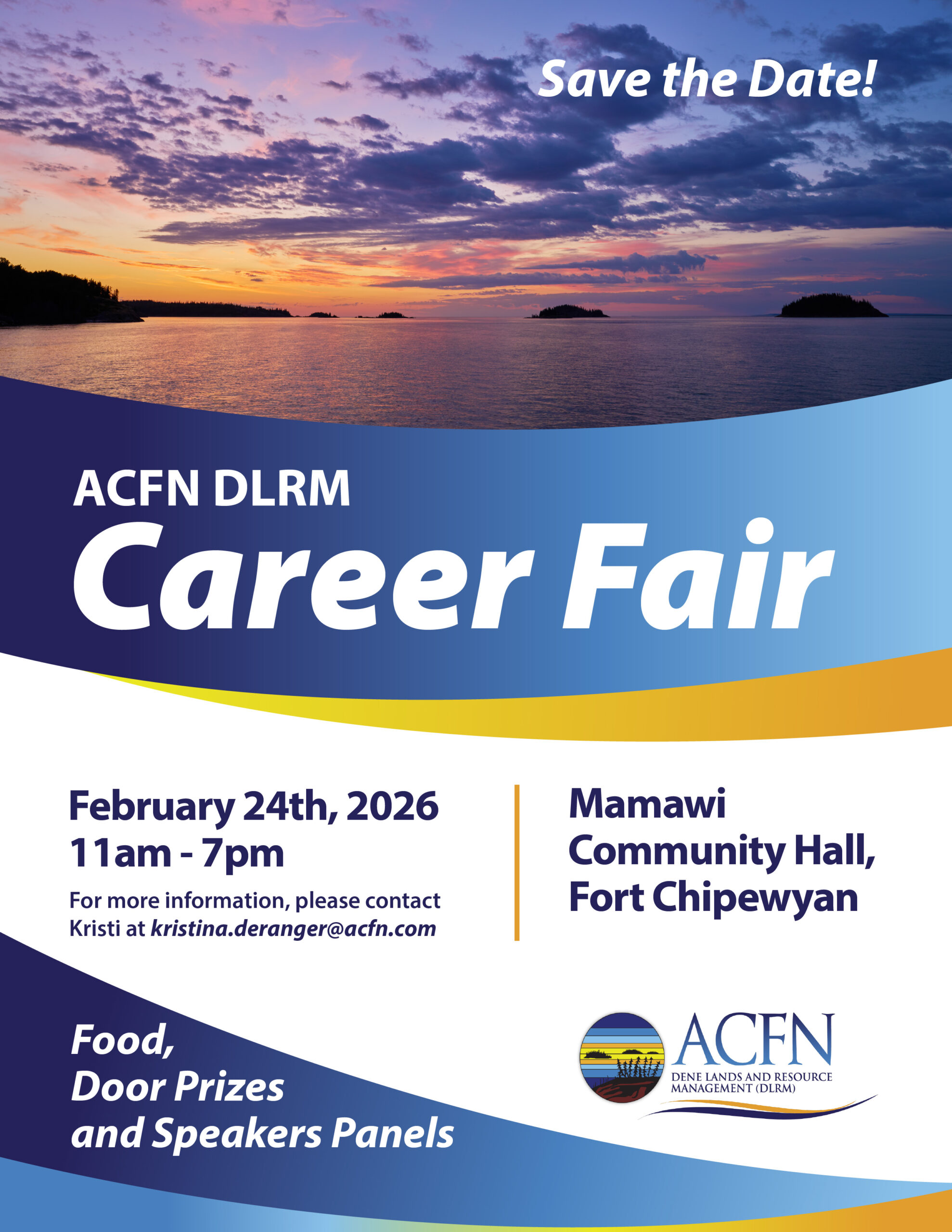 Date Feb 24 - 26 2026 Time 11:00 am - 7:00 pm ACFN DLRM Career Fair – Fort Chipewyan Share this event + Add to Google Calendar + iCal / Outlook export 00 days 00 hours 00 minutes 00 seconds