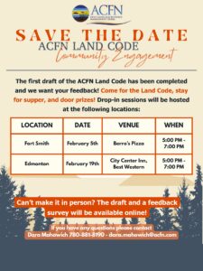 Date Feb 05 2026 Expired! Time 5:00 pm - 8:00 pm ACFN Land Code Community Engagement – Fort Smith Share this event + Add to Google Calendar + iCal / Outlook export