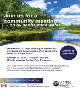 Date Oct 28 2025 Expired! Time 6:00 pm - 6:00 pm Community Meeting – Oil Sands Mine Water Share this event + Add to Google Calendar + iCal / Outlook export
