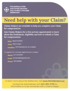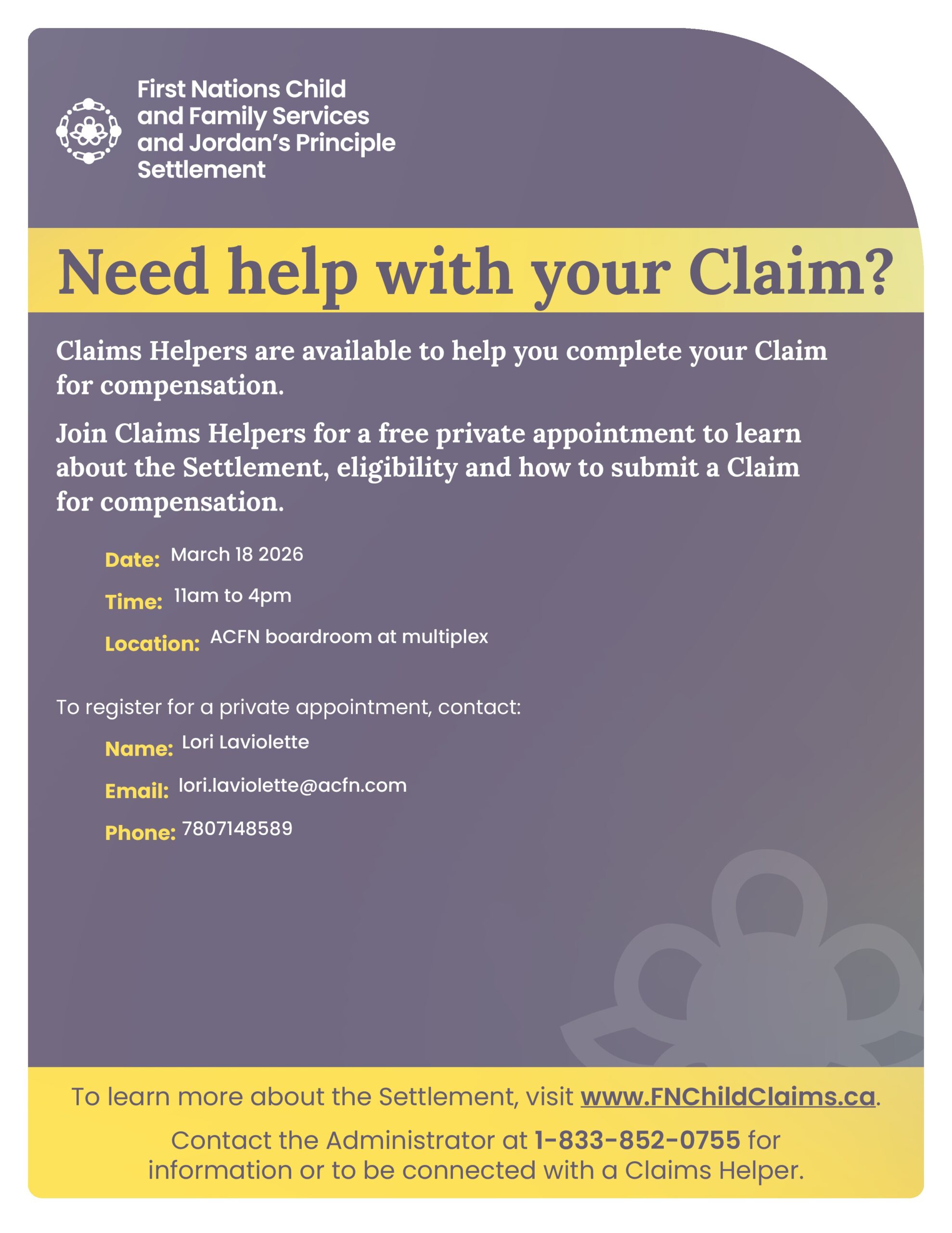 Date Mar 18 2026 Time 11:00 am - 4:00 pm First Nations Child and Family Services and Jordan’s Principle – Claims Assistance Need help with your claim? March 18 11 am – 4 pm ACFN Boardroom at Multiplex To register for a private appointment: lori.laviolette@acfn.com 780-714-8589 Share this event + Add to Google Calendar + iCal / Outlook export 00 days 00 hours 00 minutes 00 seconds