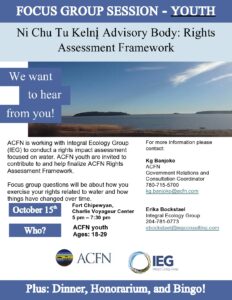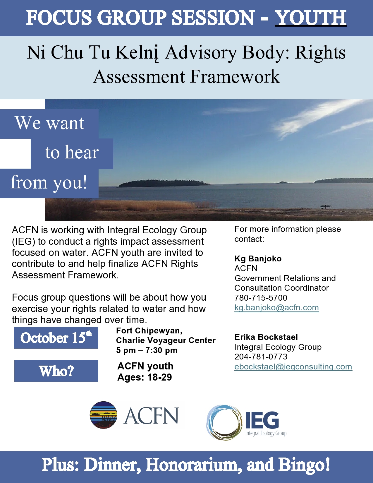 Date Oct 15 2025 Expired! Time 5:00 pm - 7:30 pm Ni Chu Tu Kelni Advisory Body Rights Assessment Framework: Youth Focus Group Share this event + Add to Google Calendar + iCal / Outlook export