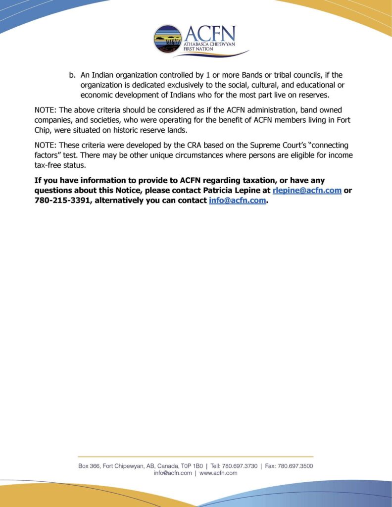 ACFN is negotiating with Canada for fair treatment regarding taxation, as many members may have been unfairly taxed due to the lack of reserve lands in Fort Chip.