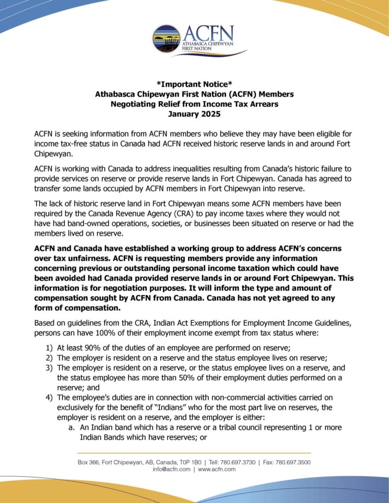 ACFN is gathering information from members who may have been eligible for income tax-free status had historic reserve lands been provided in Fort Chipewyan.