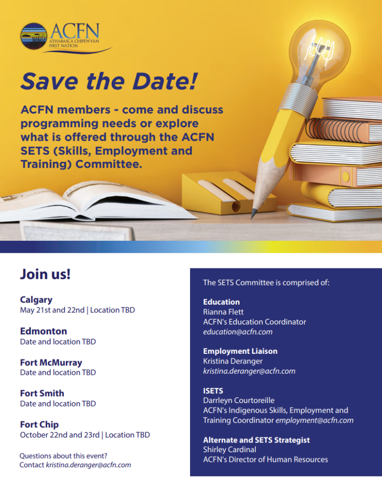 Save the date for our upcoming Employment, Education and Training Hubs meet and greet with the ACFN SETS Committee!