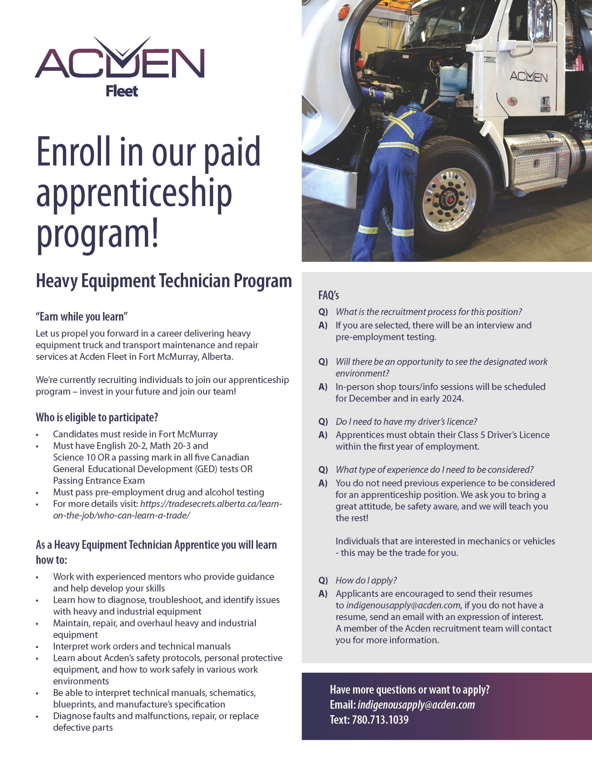 Are you an ACFN member interested in becoming a Heavy Equipment Technician Program. Do we have an opportunity for you….
