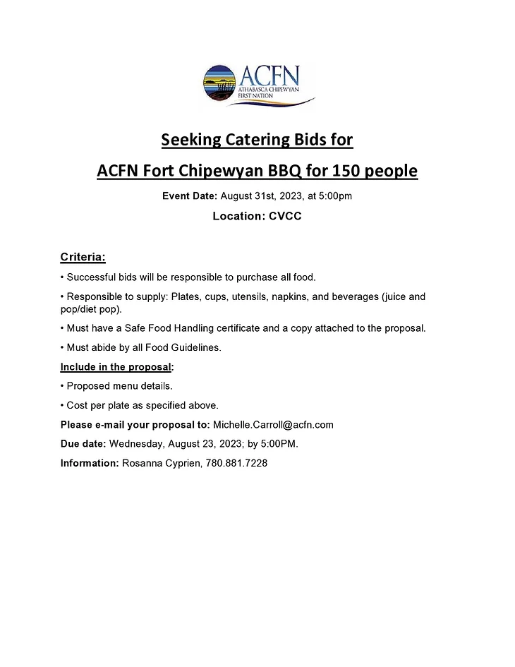 ACFN Fort Chipewyan is seeking catering bids for ACFN Member BBQs. See attached for more information.